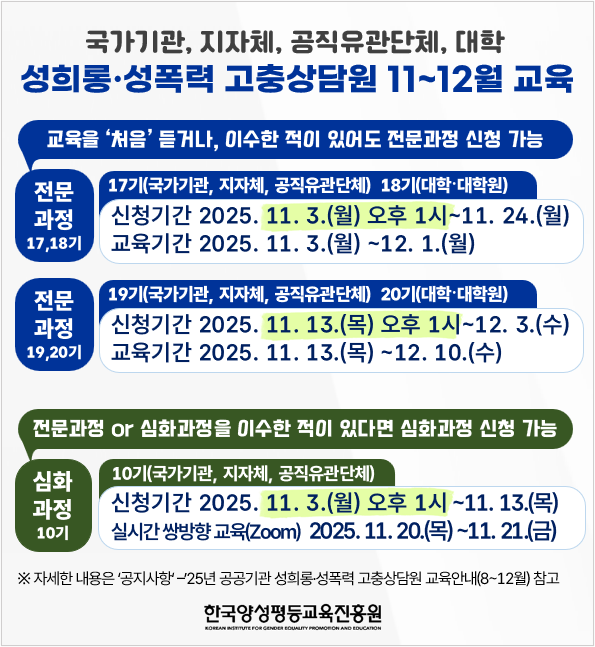 - ´25년 공공기관 성희롱·성폭력 고충상담원 교육 안내 (8~12월) 2025.07.15